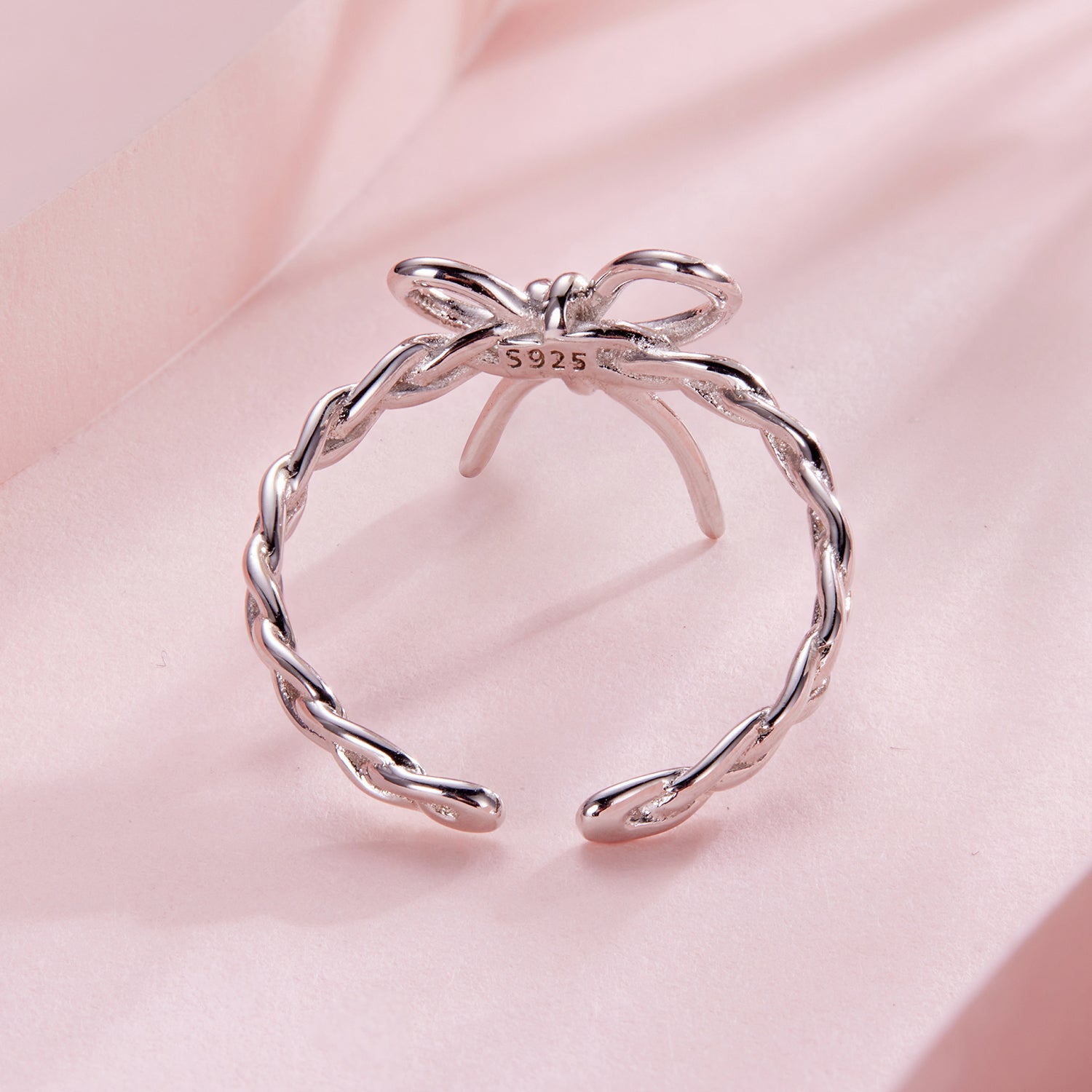 Jemný strieborný prsteň v tvare prepletenej mašličky je symbolom nežnosti, ženskosti a romantiky. Jeho otvorený dizajn s pleteným efektom sa ľahko prispôsobí akejkoľvek veľkosti prsta a dodá vášmu vzhľadu ľahký, hravý dotyk. Perfektný darček pre milovanú osobu alebo pre seba.
