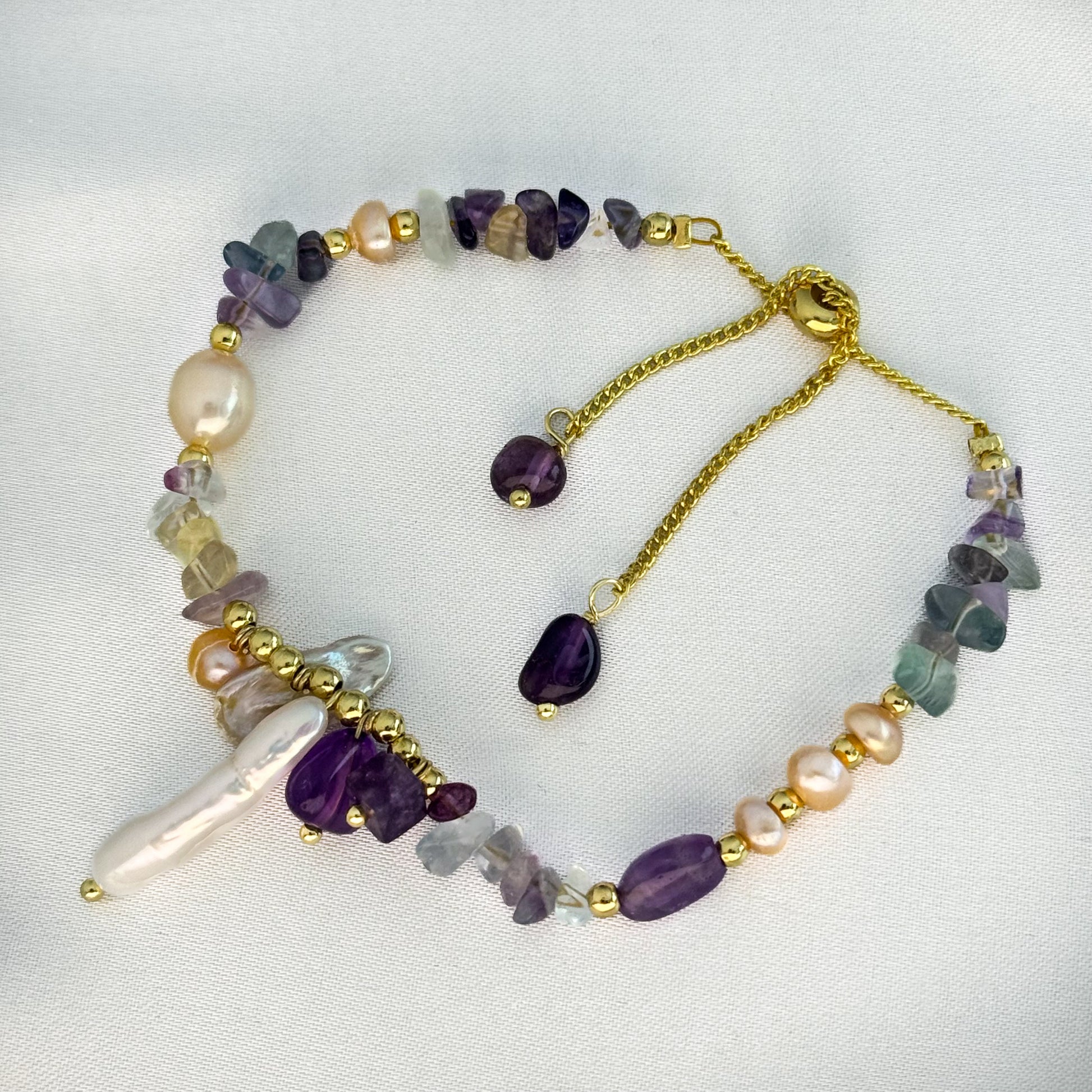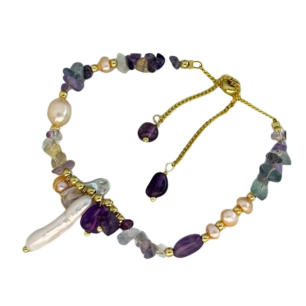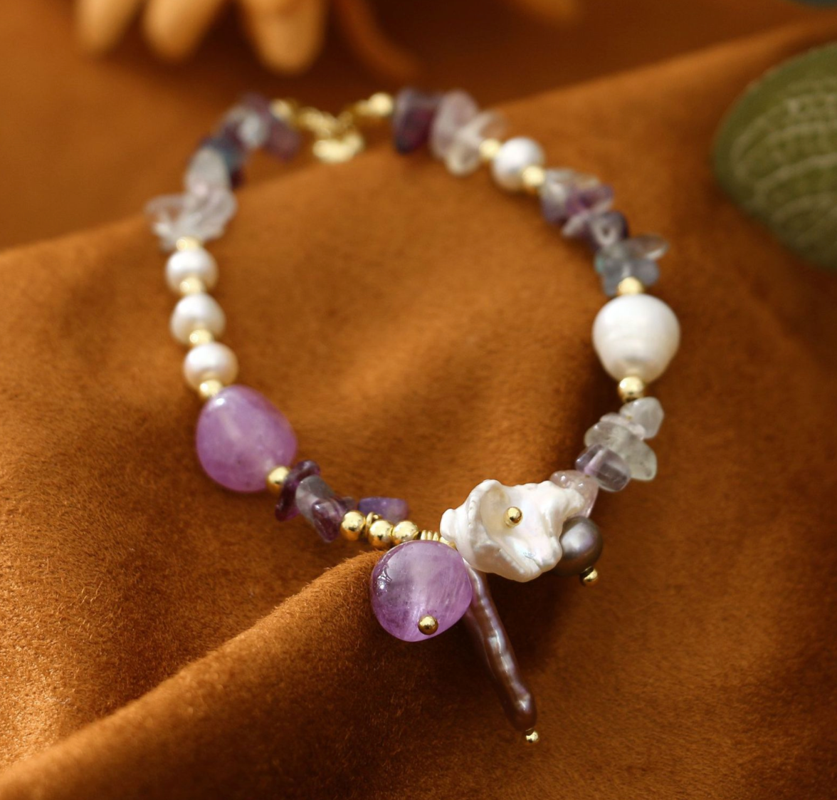 Tento nádherný náramok obsahuje harmonickú zmes lesklých sladkovodných perál, žiarivých ametystových kameňov a farebných fluoritových akcentov, ktoré sú doplnené jemnými zlatými detailmi. Jedinečná kombinácia materiálov a farieb vytvára podmanivý a elegantný dizajn. Tento náramok je ideálny na dodanie nádychu prirodzenej krásy každému outfitu a hodí sa na výnimočné príležitosti aj na sofistikované každodenné nosenie.