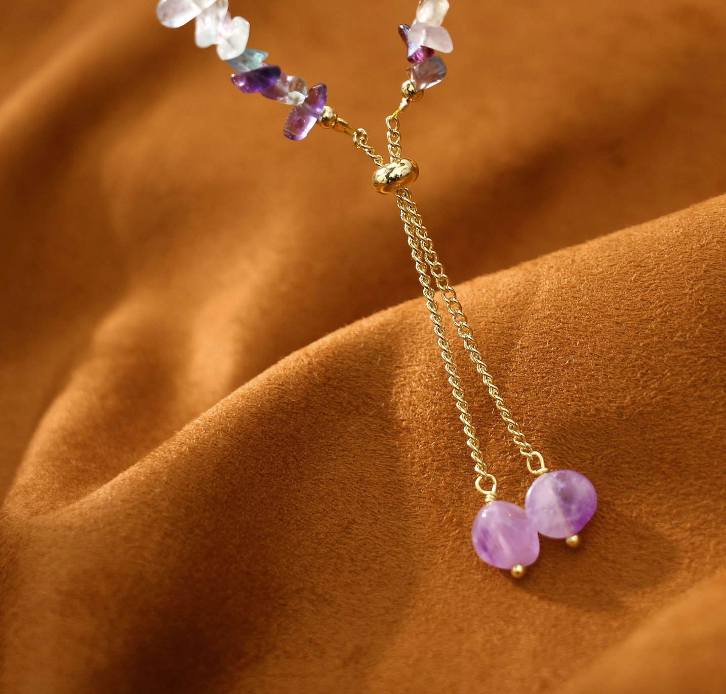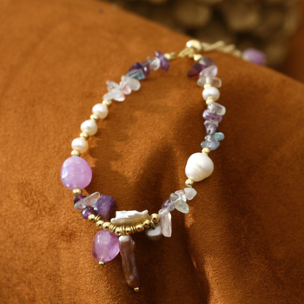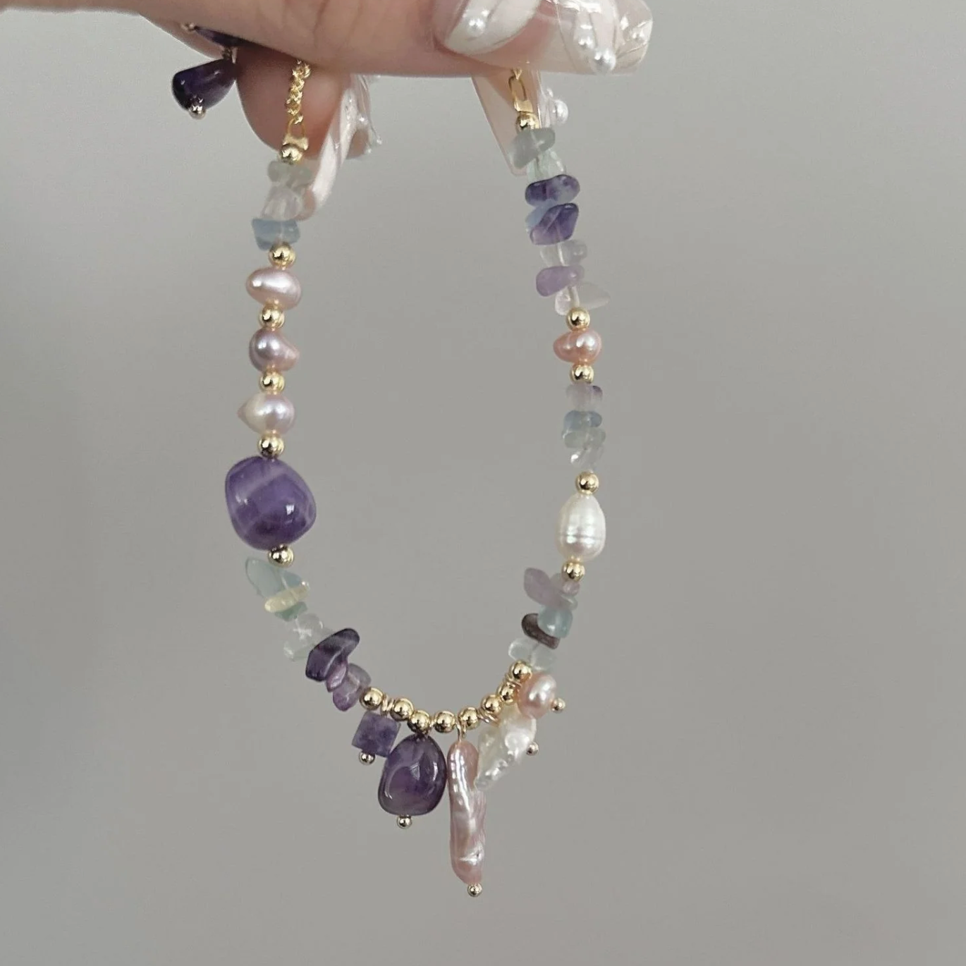 Tento nádherný náramok obsahuje harmonickú zmes lesklých sladkovodných perál, žiarivých ametystových kameňov a farebných fluoritových akcentov, ktoré sú doplnené jemnými zlatými detailmi. Jedinečná kombinácia materiálov a farieb vytvára podmanivý a elegantný dizajn. Tento náramok je ideálny na dodanie nádychu prirodzenej krásy každému outfitu a hodí sa na výnimočné príležitosti aj na sofistikované každodenné nosenie.