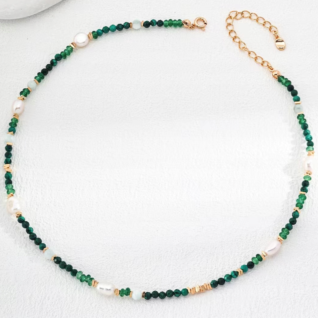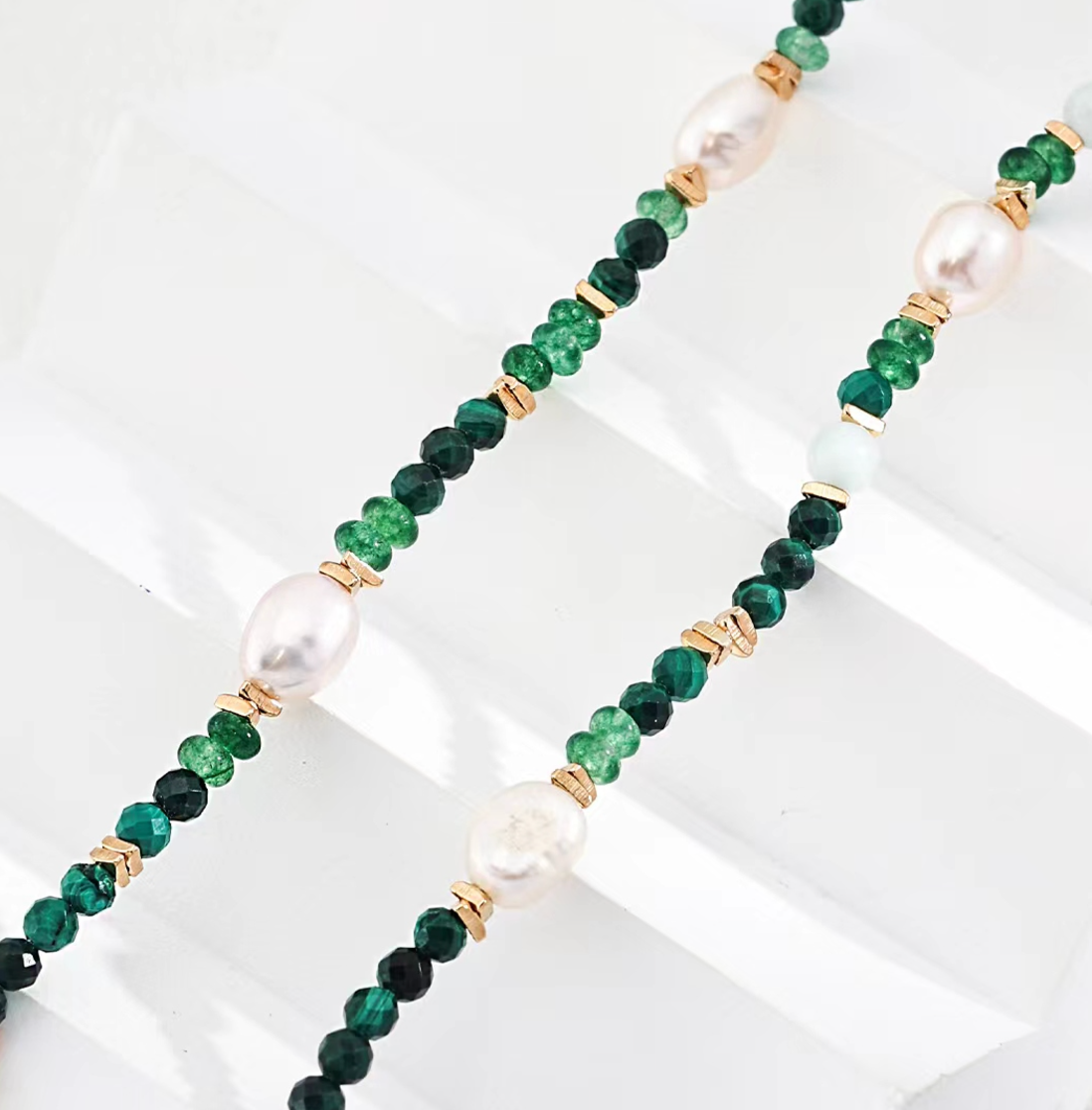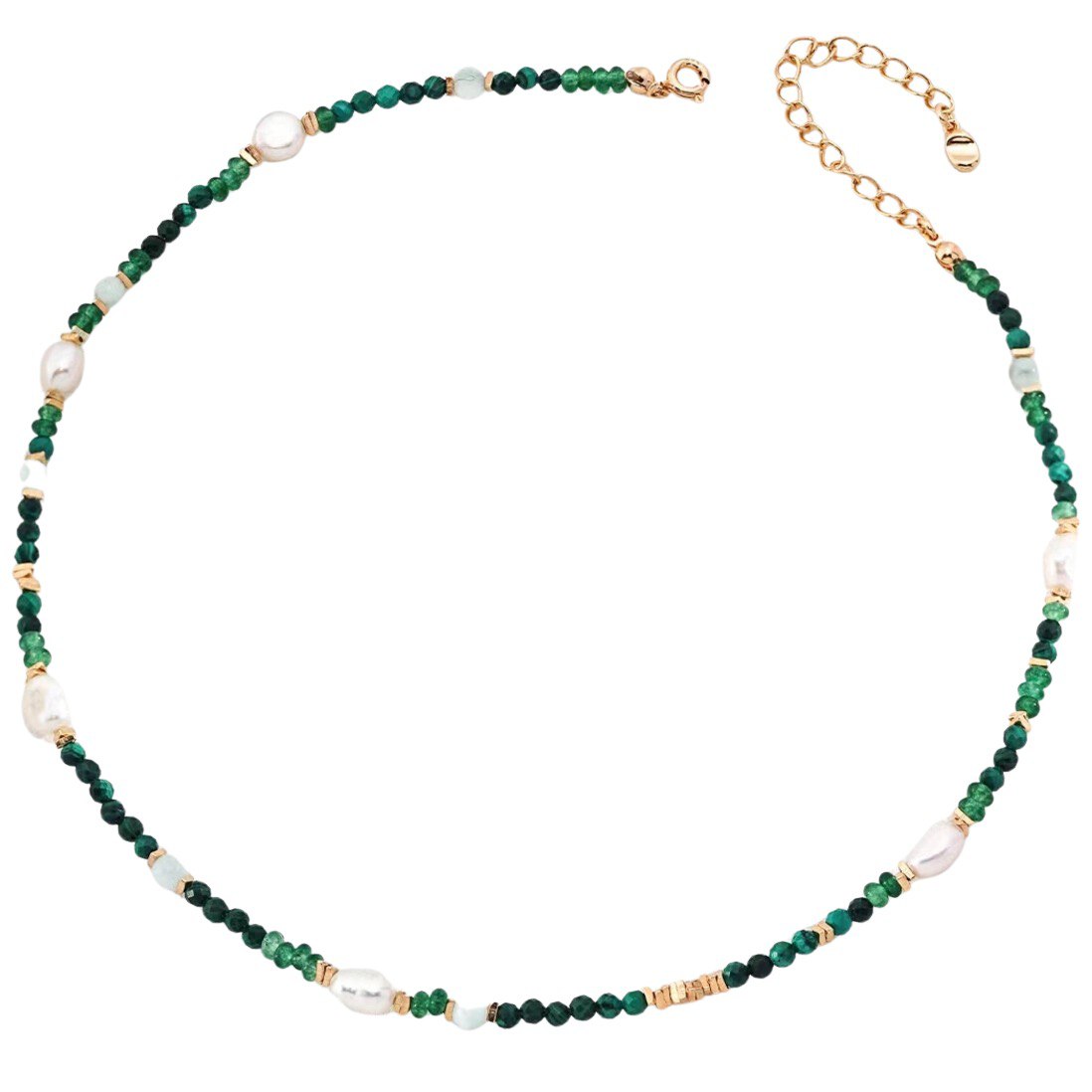 Jemné náhrdelník s korálkami z tmavozeleného achátu, bielymi sladkovodnými perlami a zlatými detailami. Priehľadné opálové korálky dodávajú jemný lesk, čím vytvárajú jedinečný šperk pre modernú ženu, ktorá miluje prírodné tóny.