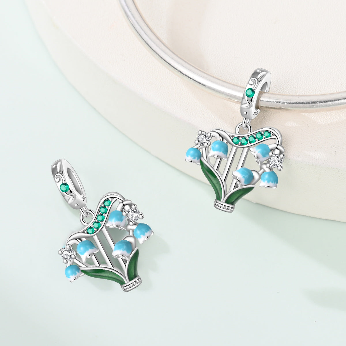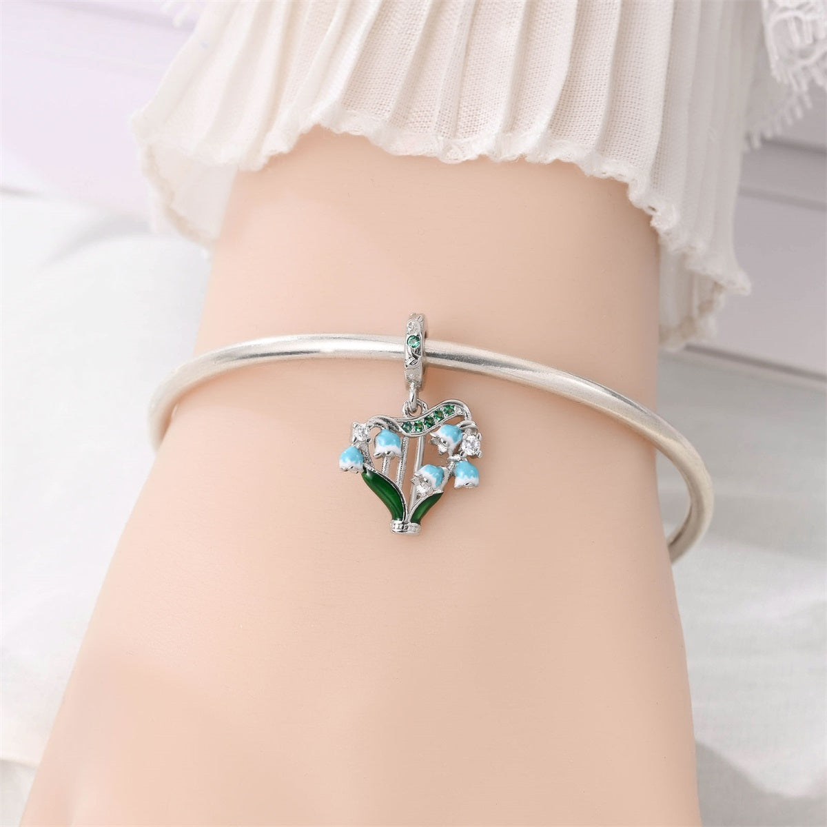Elegantný prívesok s motívom nežných konvaliniek symbolizuje čistotu, šťastie a nový začiatok. Jemné modrobiele kvety dopĺňajú zelené lístky a trblietavé kamienky, ktoré spolu vytvárajú romantický a svieži dizajn inšpirovaný prírodou. Ideálny doplnok pre milovníčky kvetov a jemných detailov, ktorý krásne oživí každý náramok.