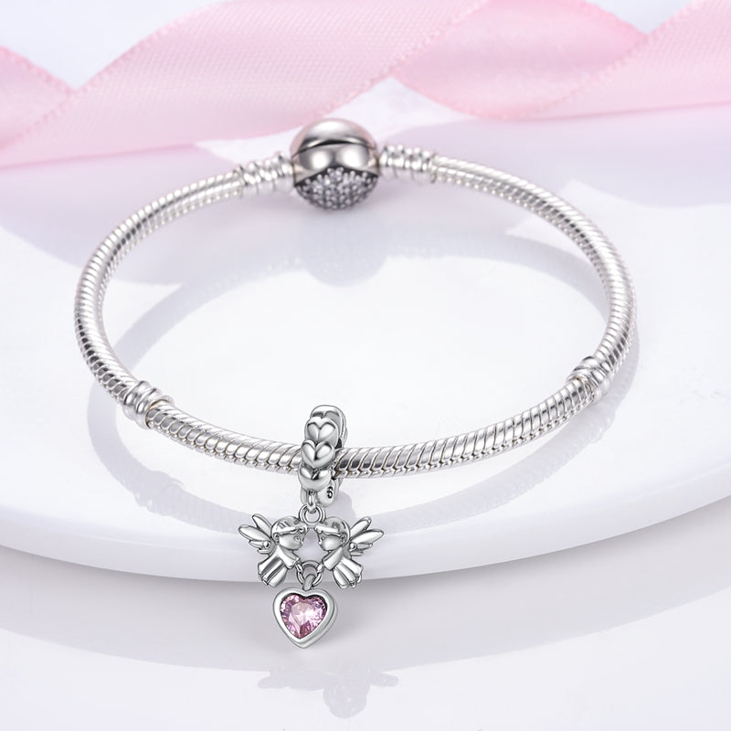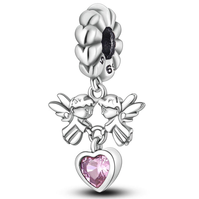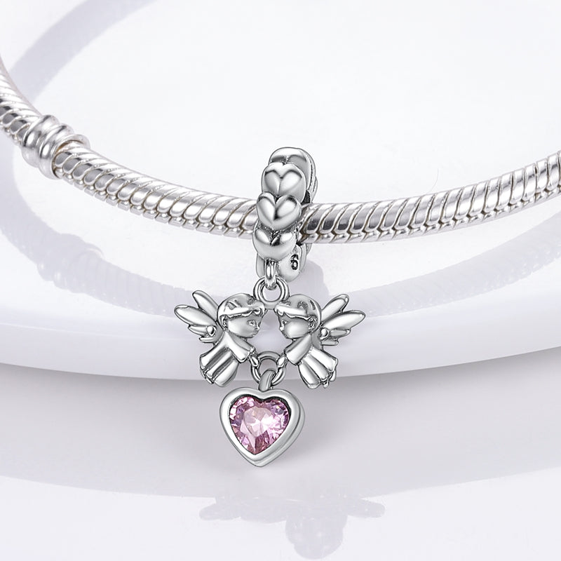 Táto nežná korálka Anjelska láska je symbolom ochrany, čistoty a hlbokej náklonnosti. Dvaja anjelikovia držia v rukách srdce s jemným ružovým kryštálom, ktorý vyžaruje lásku a nežnosť.