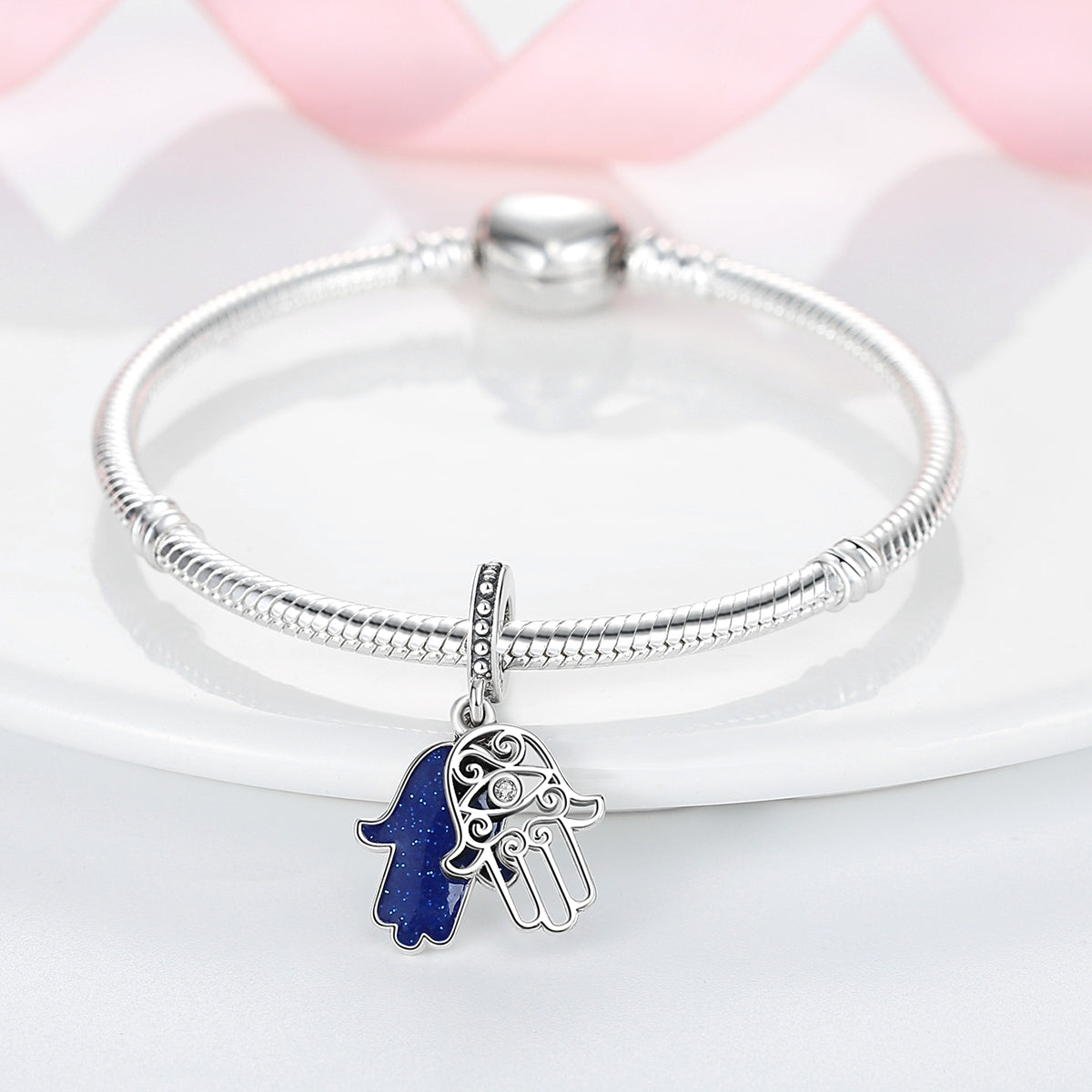 Ochranný prívesok s motívom hamsy a očkom, doplnený tmavomodrým trblietavým pozadím. Symbol bezpečia, intuície a pozitívnej energie.