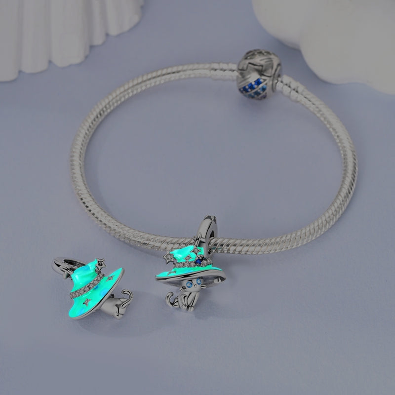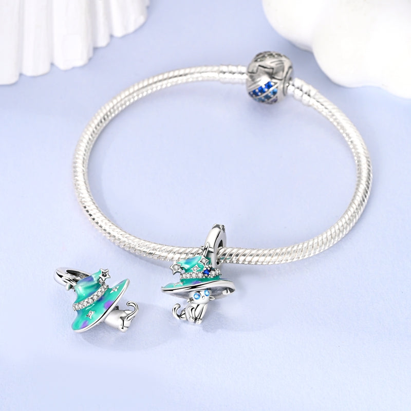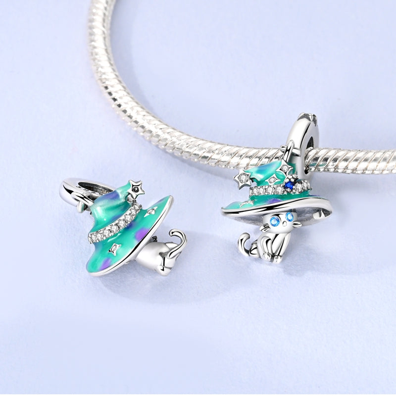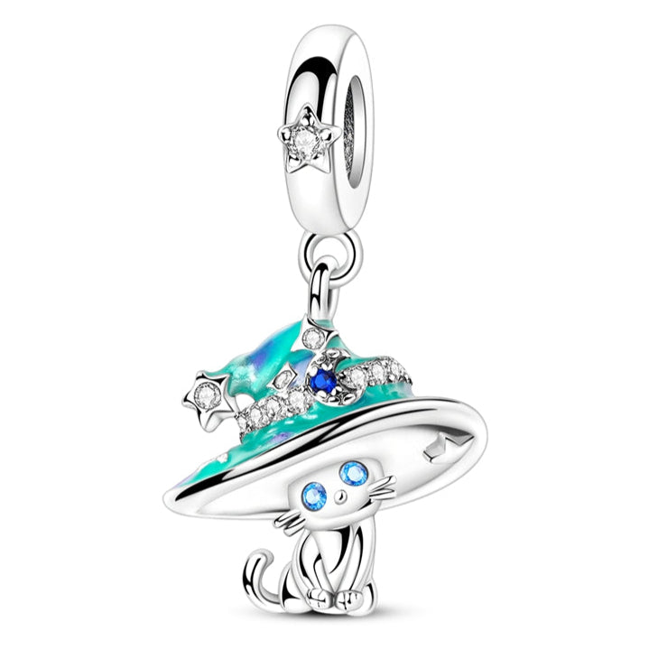 Tento hravý a očarujúci prívesok predstavuje rozkošnú mačičku s veľkým čarodejníckym klobúkom posiatym hviezdami, zirkónmi a modrými očami, ktoré žiaria ako nočná obloha. Vyrobený zo striebra 925 a zdobený farebným smaltom, je dokonalým doplnkom pre milovníkov mačiek a fantázie.