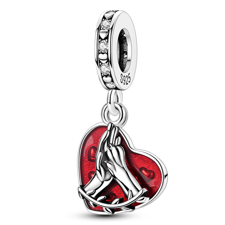 Výrazný prívesok v tvare červeného srdca, v ktorom sa spájajú dve ruky v geste porozumenia, modlitby alebo hlbokej vďaky. Okolo nich sa vinie vetvička ako symbol rastu a prepojenia. Prívesok je vyrobený zo striebra 925, zdobený zirkónmi a sýtočerveným smaltom s drobnými srdiečkami na pozadí.