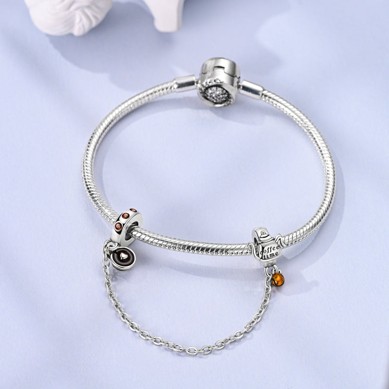 Táto rozkošná bezpečnostná retiazka ochráni váš náramok pred nechceným otvorením a zároveň prinesie kúsok kávovej nálady do vášho každodenného štýlu. Na jednom konci retiazky sa nachádza šálka kávy, na druhom čajník s nápisom „coffee time“ a kávové zrno. Hnedé zirkóny dodávajú prívesku teplý akcent.