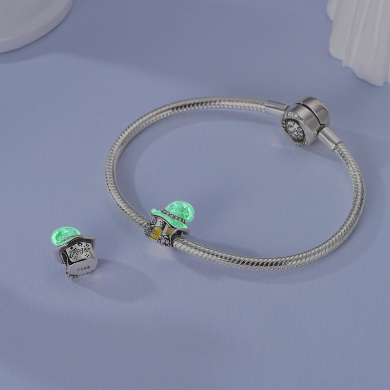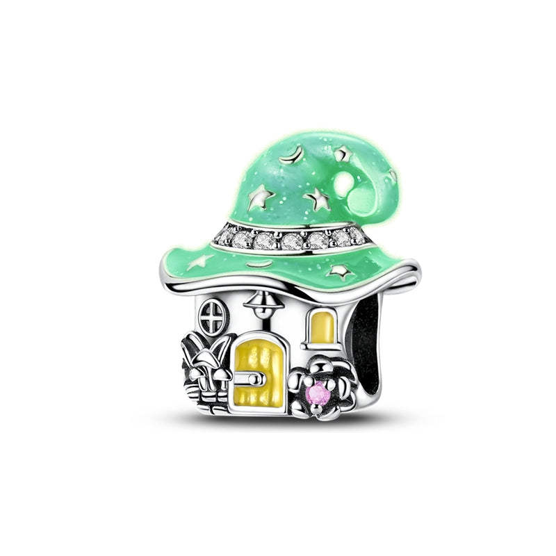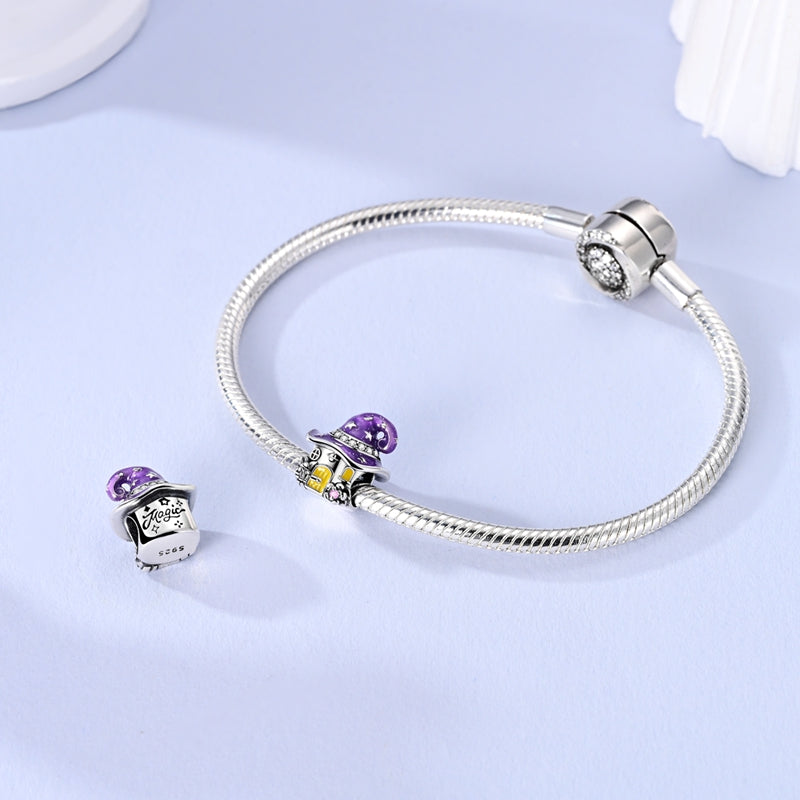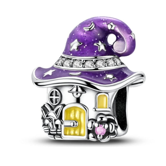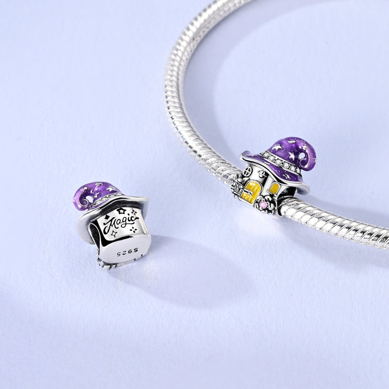 Rozprávkový strieborný prívesok v tvare malého domčeka s čarodejníckym klobúkom ako strechou. Fialová glazúra so zlatými hviezdičkami a mesačikmi spolu s detailmi ako kvety a žlté dvere vytvárajú čarovný dizajn. Ideálny doplnok pre milovníkov fantázie, rozprávok a kúziel. Kompatibilný s náramkami Pandora.