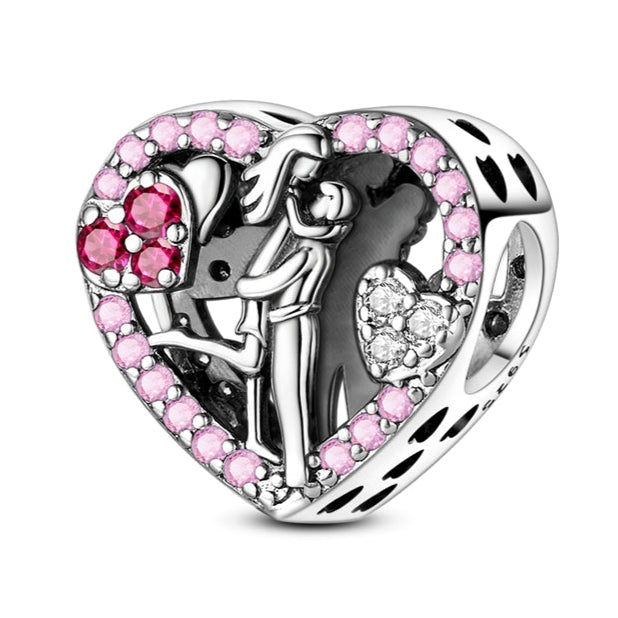 Romantický prívesok v tvare srdca zachytáva láskyplný moment objatia medzi dvoma milujúcimi sa postavami. Rámik je osadený jemnými ružovými kamienkami, ktoré podčiarkujú nežnosť okamihu. Na ľavej strane sa vyníma srdce zo sýto ružových zirkónov, vpravo zas žiari drobný detail z čírych kamienkov.