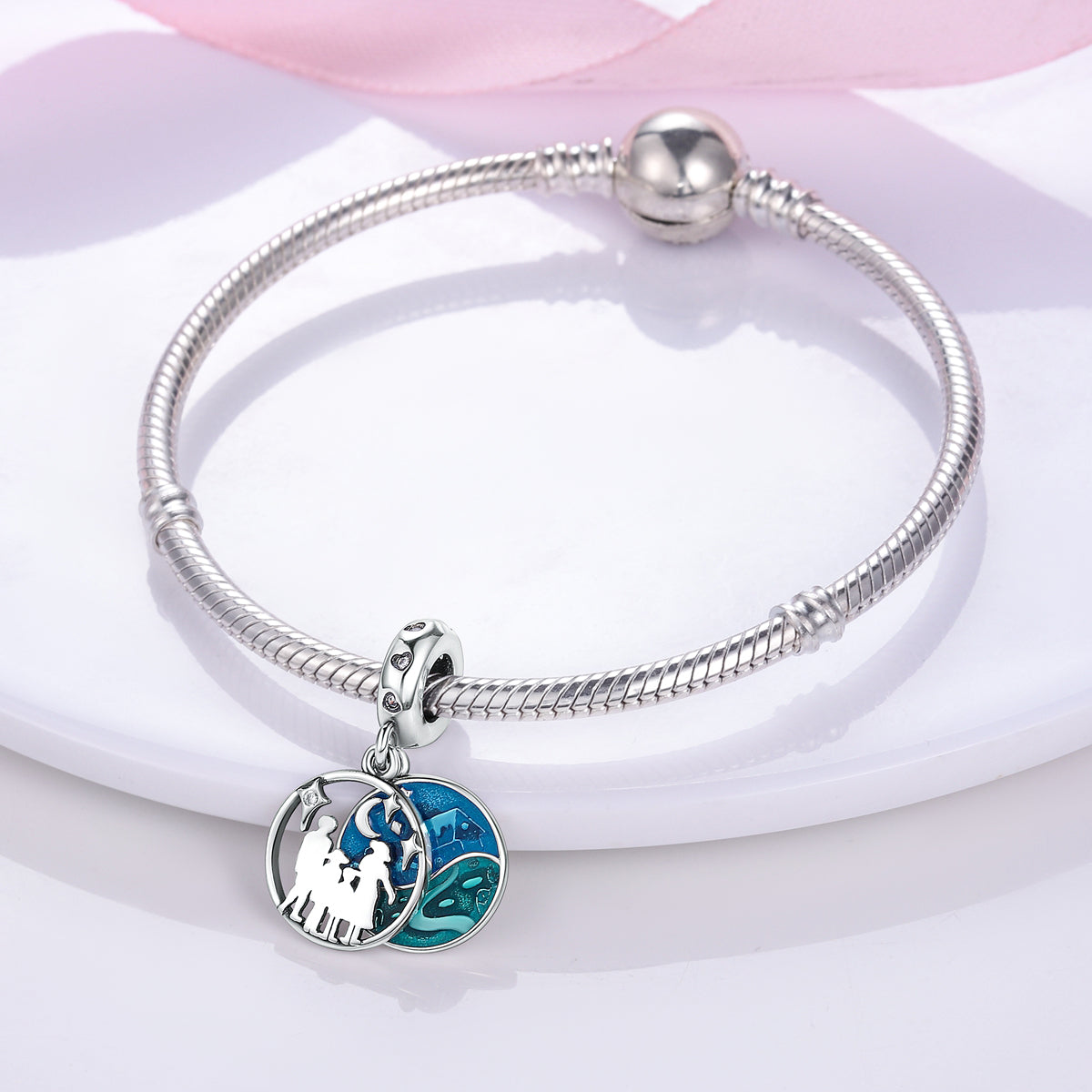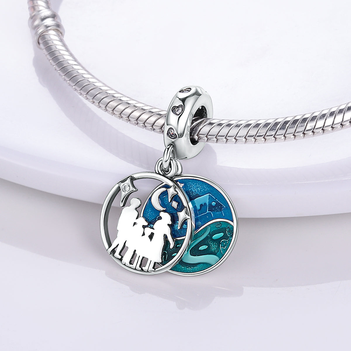 Romantický prívesok s dvojitým motívom – silueta rodiny pod hviezdnou oblohou a nočná krajina v modrých odtieňoch. Symbol spojenia, lásky a spoločných ciest.