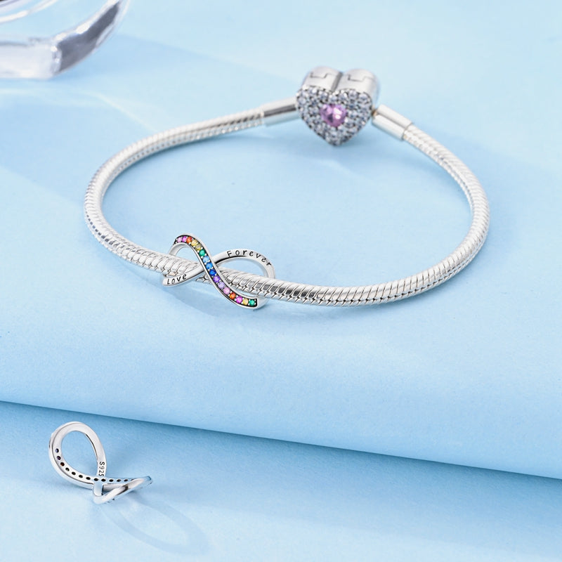 Elegantný prívesok v tvare symbolu nekonečna zdobený žiarivými farebnými zirkónmi predstavuje večnú lásku, priateľstvo a nekonečné spojenie. Jemné nápisy „Love“ a „Forever“ dodávajú šperku romantický význam a robia z neho krásny doplnok na každý deň aj výnimočný darček pre blízku osobu.