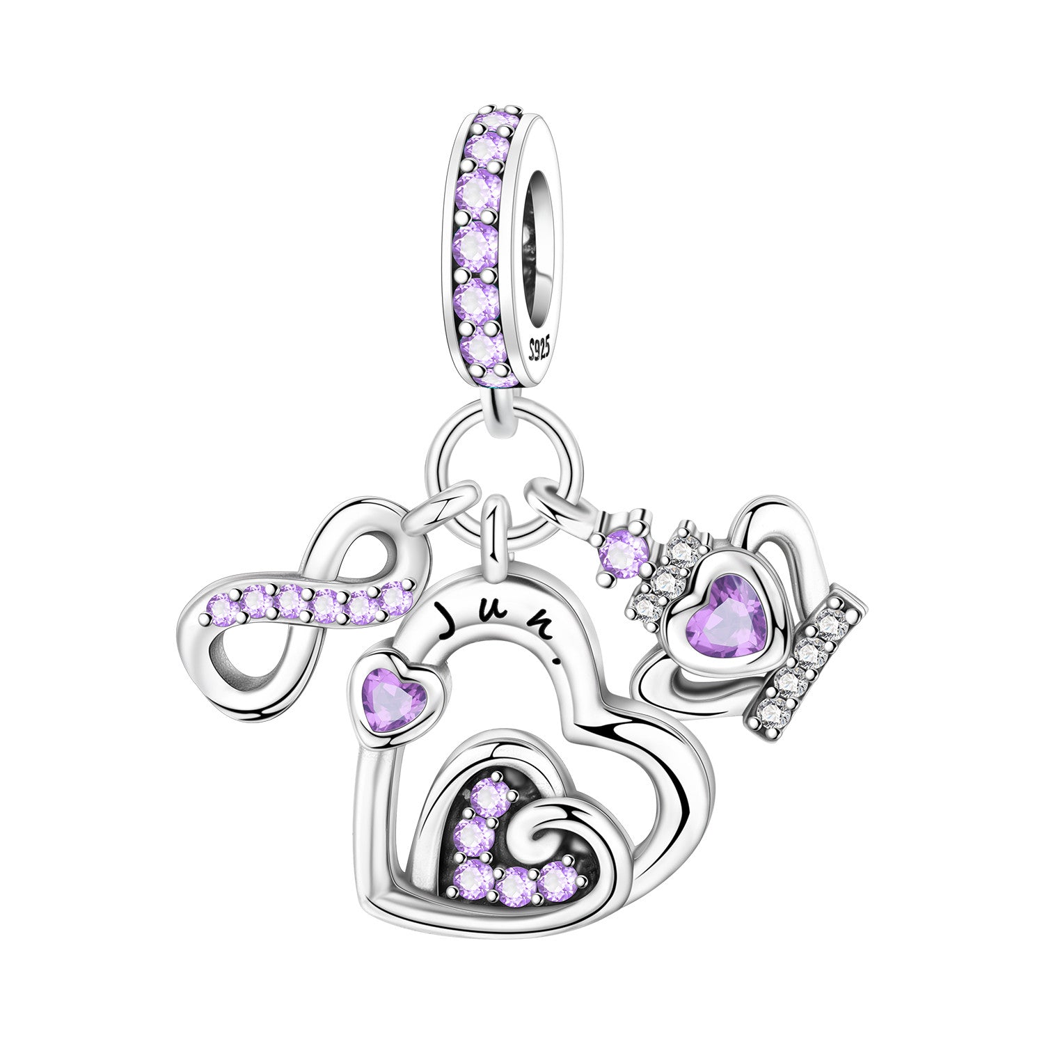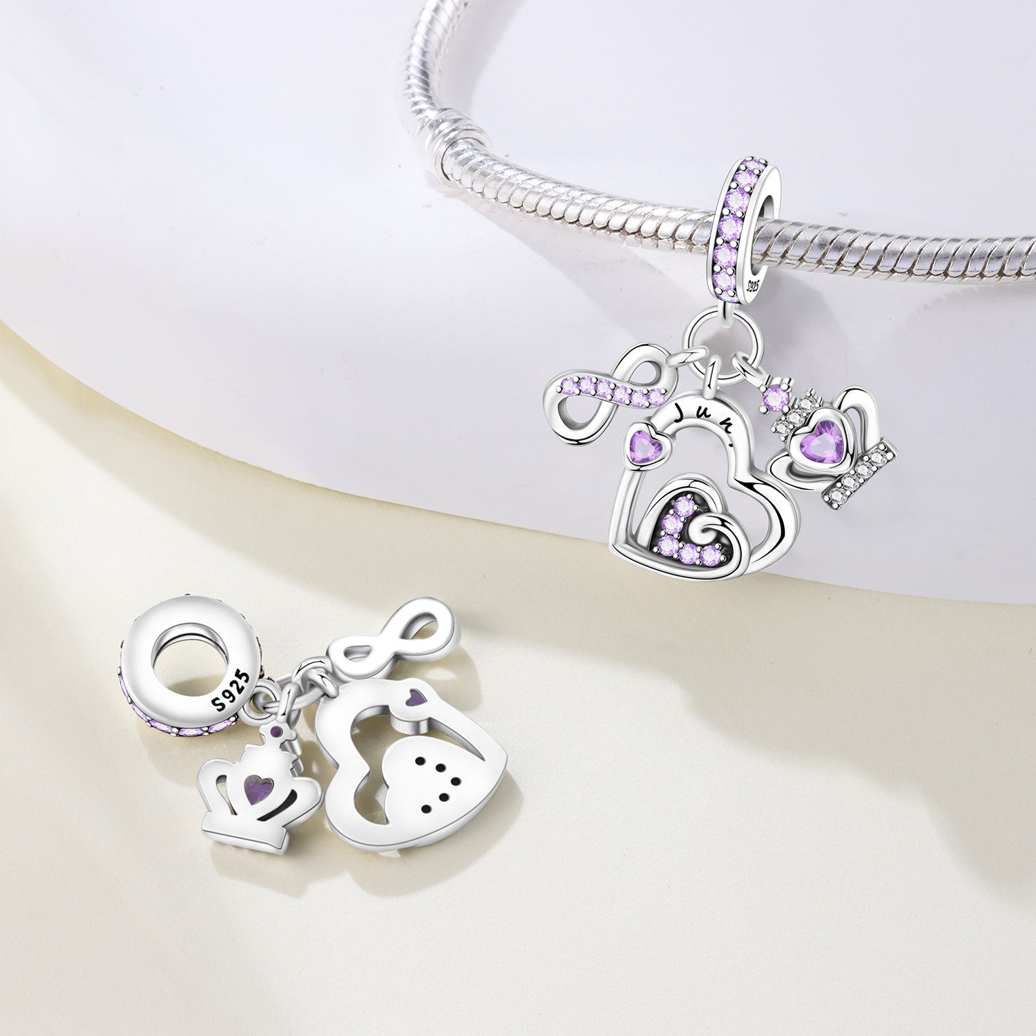Elegantný strieborný prívesok Nekonečná láska spája symboly, ktoré hovoria priamo k srdcu. Fialové zirkóny zdobia znak nekonečna, srdcia aj korunku – každý detail žiari nežnosťou a romantikou. Tento šperk je vyjadrením večnej lásky, oddanosti a krásnych spomienok, ktoré pretrvávajú navždy.
