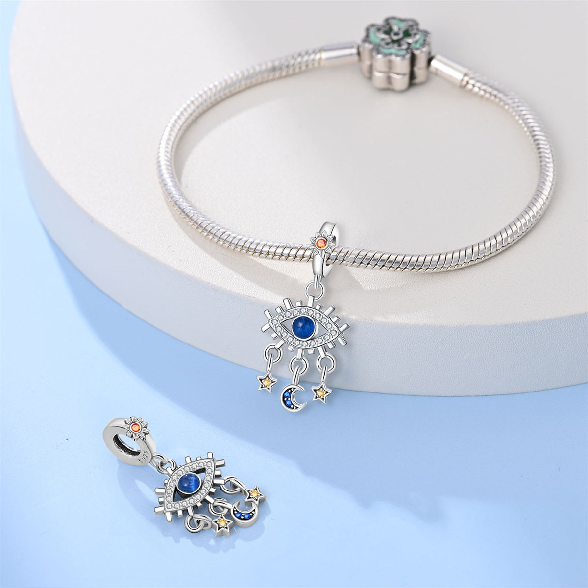 Magický prívesok so symbolom oka, ktorý už stáročia predstavuje ochranu, intuíciu a vnútornú múdrosť. Stred tvorí hlboký modrý kameň obklopený trblietavými zirkónmi. Z oka visia hviezdy a mesiac, ktoré symbolizujú spojenie s vesmírom a jeho cyklami. Ideálny šperk pre každého, kto verí v energiu talizmanov a silu zámeru.