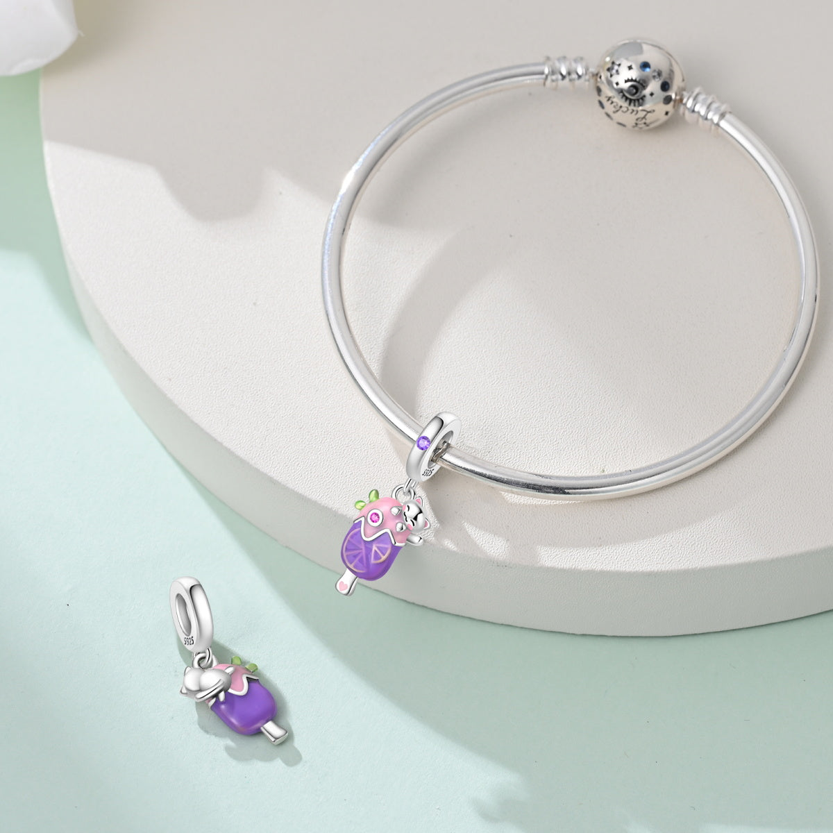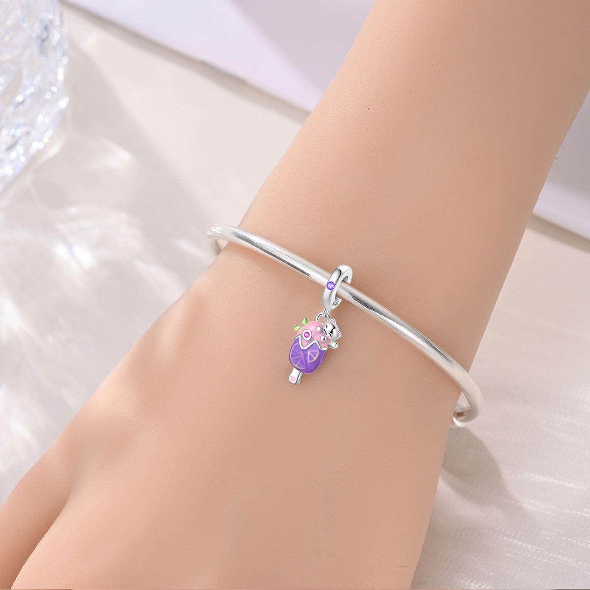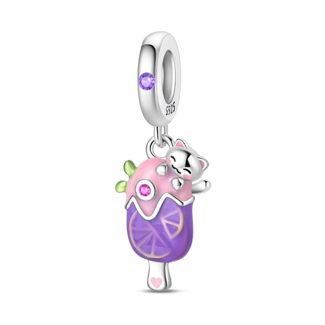 Veselý prívesok v tvare farebnej zmrzliny zdobenej usmiatou mačičkou a ružovými a fialovými kryštálmi. Tento roztomilý dizajn prináša radosť, hravosť a letnú náladu do každého dňa. Ideálny ako darček pre milovníkov sladkostí, mačičiek a jedinečných šperkov. Kompatibilný s náramkami Pandora.