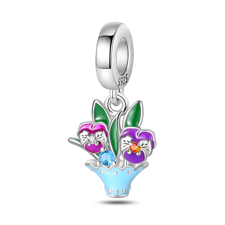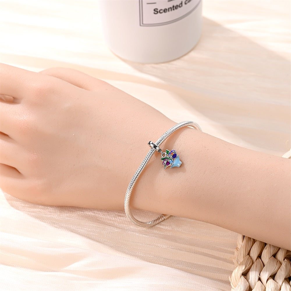 Nádherný prívesok ako malá jarná rozprávka. Modrý košík ukrýva dve fialky s ručne maľovaným smaltom a ligotavými kamienkami v strede. Zelené lístky dopĺňajú živý kvetinový motív, ktorý v sebe nesie jemnosť, sviežosť a návrat radosti.
