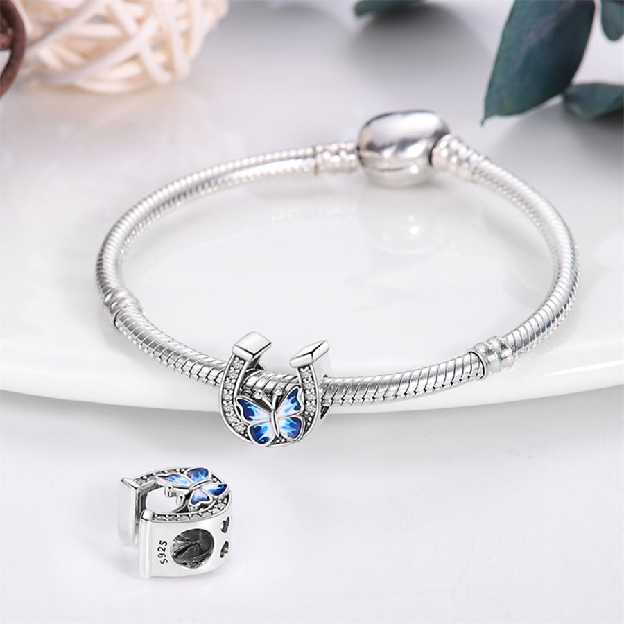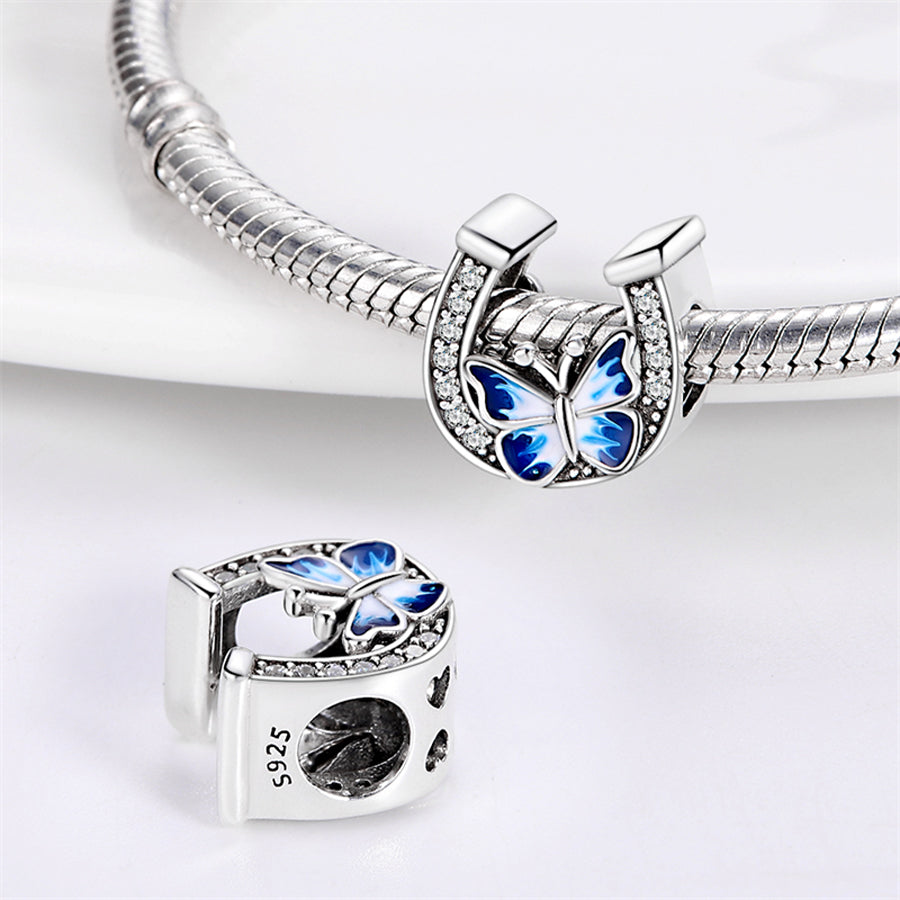 Elegantný prívesok v tvare podkovy zdobený jemným modrým motýľom symbolizuje šťastie, slobodu a nové začiatky. Lesklé zirkóny po okrajoch dodávajú šperku žiarivý vzhľad a zvýrazňujú jeho jemný dizajn. Ideálny doplnok pre milovníčky originálnych detailov a symbolických šperkov.