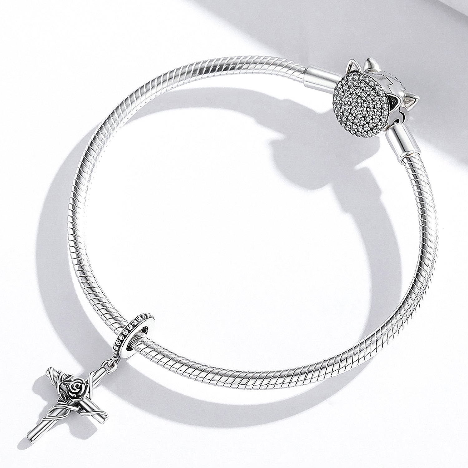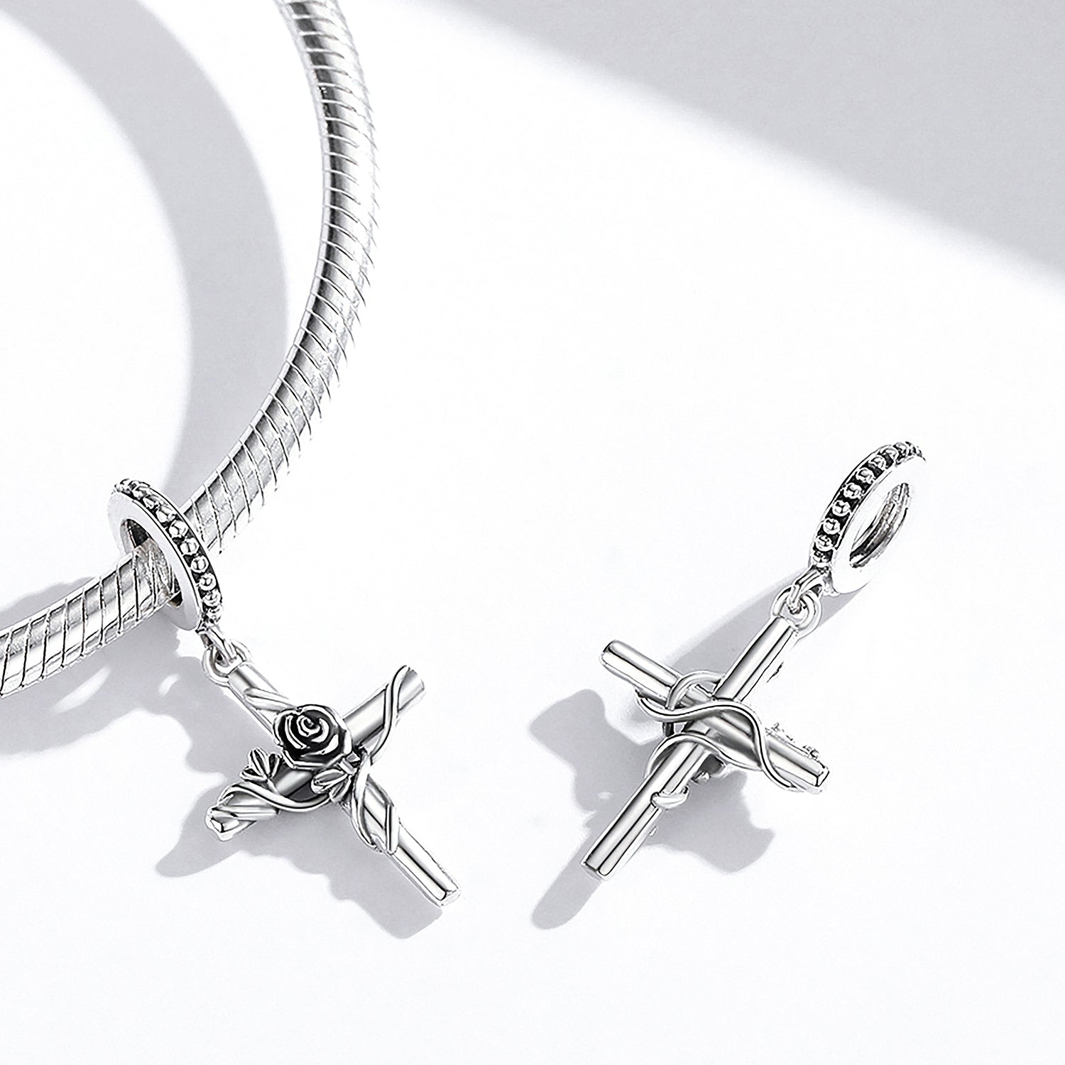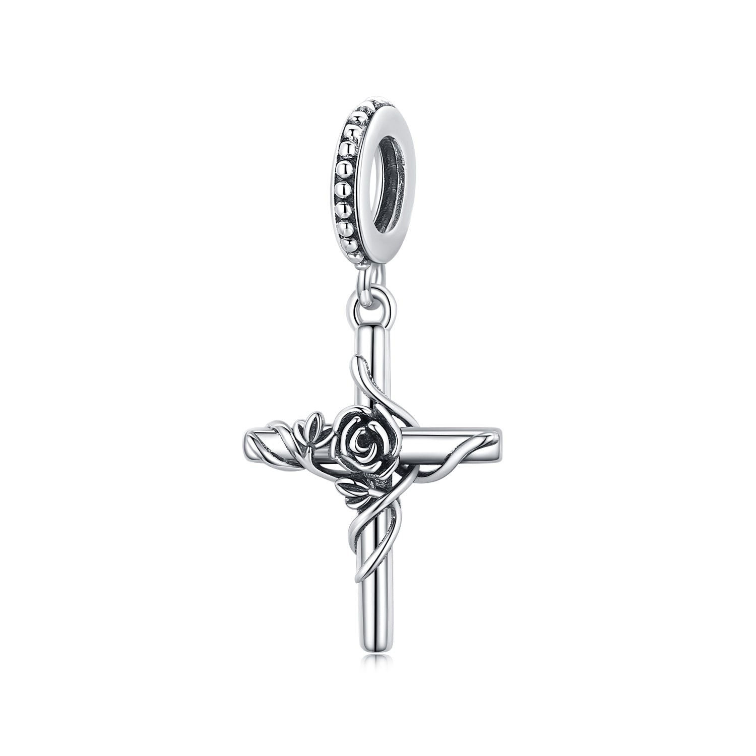 Tento umelecky stvárnený prívesok spája dva silné symboly – vieru a nehynúcu lásku. Dominantný hladký kríž je nežne obrastený detailne vypracovanou ružou s lístkami, ktorá sa plynule vinie okolo jeho ramien. Kontrast medzi čistými líniami kríža a organickým tvarom kvetu dodáva šperku hĺbku a dramatický efekt. Záves prívesku je zdobený jemným gravírovaním, ktoré podčiarkuje precízne spracovanie každého detailu.