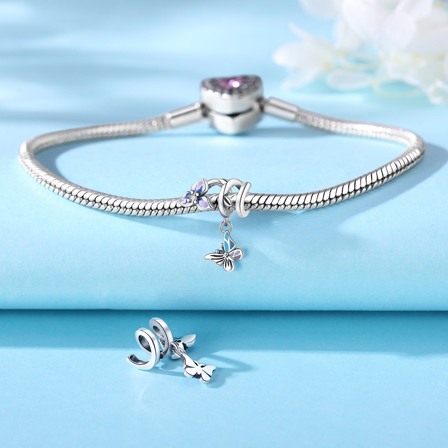 Delikátny šperk, ktorý zachytáva poéziu prírody. Tento prívesok z rýdzeho striebra 925 je jedinečne tvarovaný – jemný kvet s trblietavým zirkónom sa vinie okolo náramku ako živá vetvička, z ktorej visí elegantný motýľ s pastelovými smaltovanými krídlami v odtieňoch modrej a fialovej.