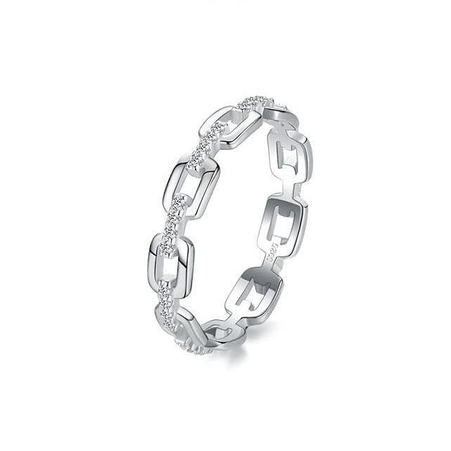 Moderný strieborný prsteň v štýle prepojených článkov spája výrazný dizajn s jemným leskom drobných kamienkov. Zaujímavá štruktúra vytvára originálny a nadčasový vzhľad, ktorý sa hodí k elegantným aj každodenným outfitom. Kombinácia hladkého povrchu a trblietavých detailov dodáva prsteňu luxusný nádych, pričom si zachováva minimalistickú eleganciu. Vyrobený je zo striebra, čo zabezpečuje kvalitu, odolnosť a pohodlné nosenie.