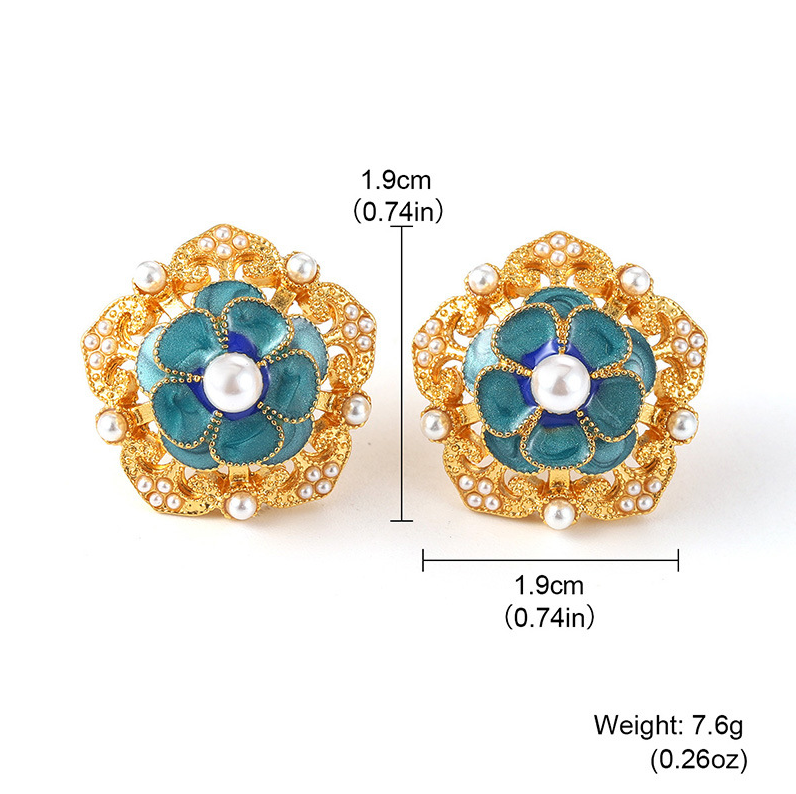 Tieto náušnice sú elegantné a luxusné, s dizajnom inšpirovaným kvetinovými motívmi. Ich stredovým prvkom je tyrkysovo-modrý kvet zdobený perlou v strede. Okolie kvetu je vyhotovené v zlatých odtieňoch s precíznymi detailmi a drobnými perlami na okrajoch, čo vytvára bohatý a sofistikovaný vzhľad.