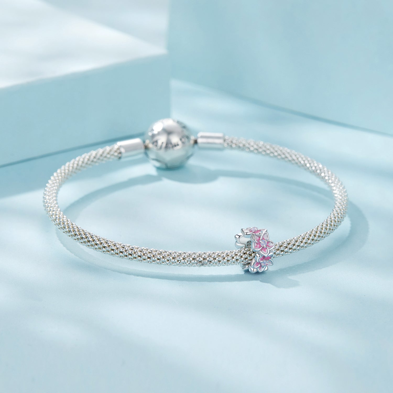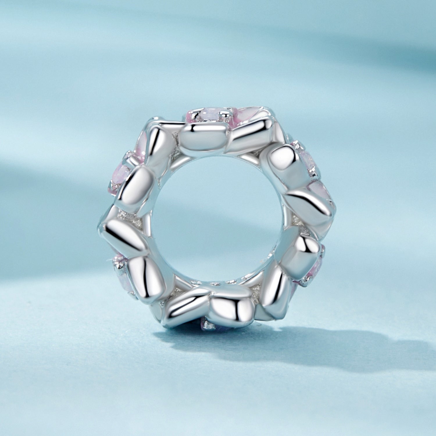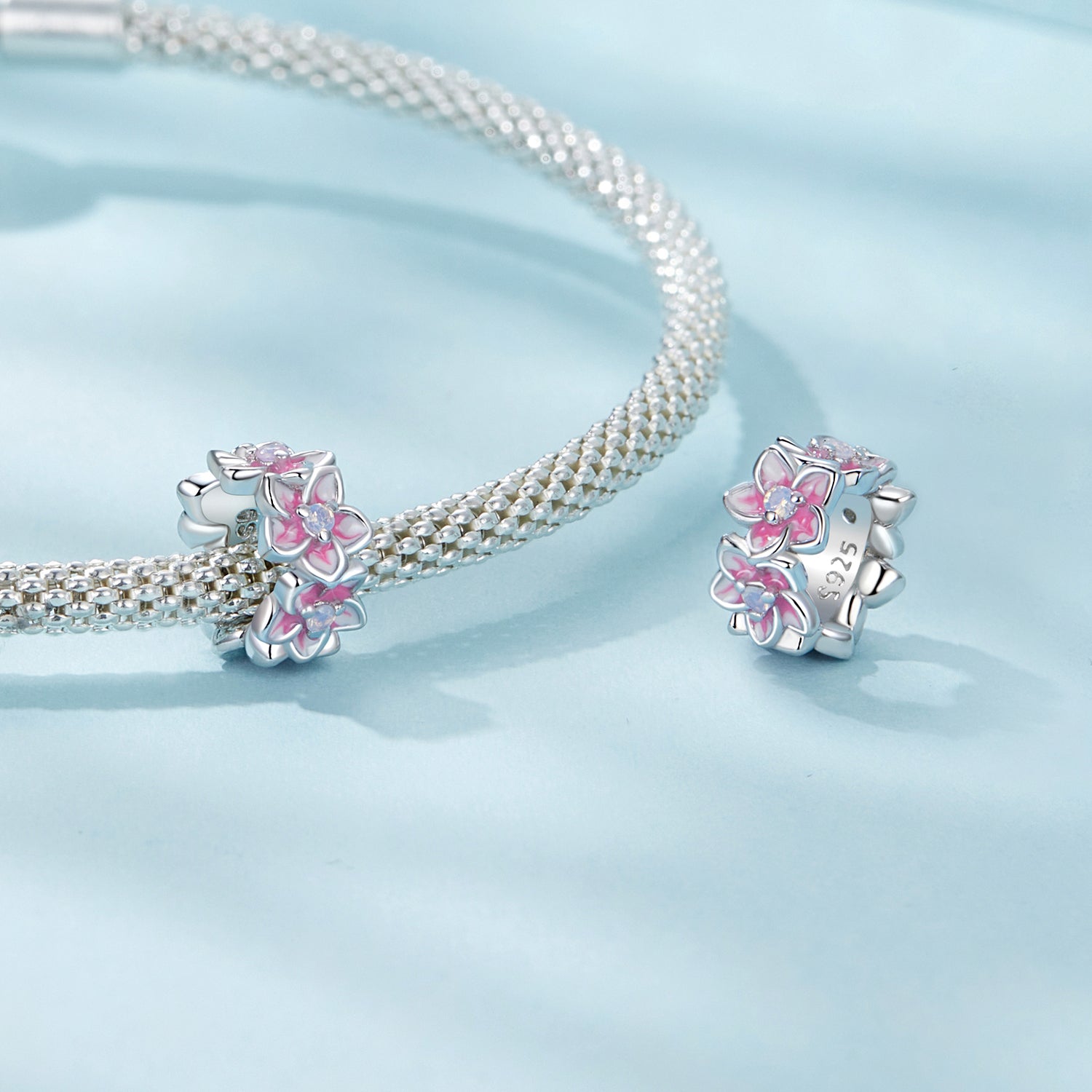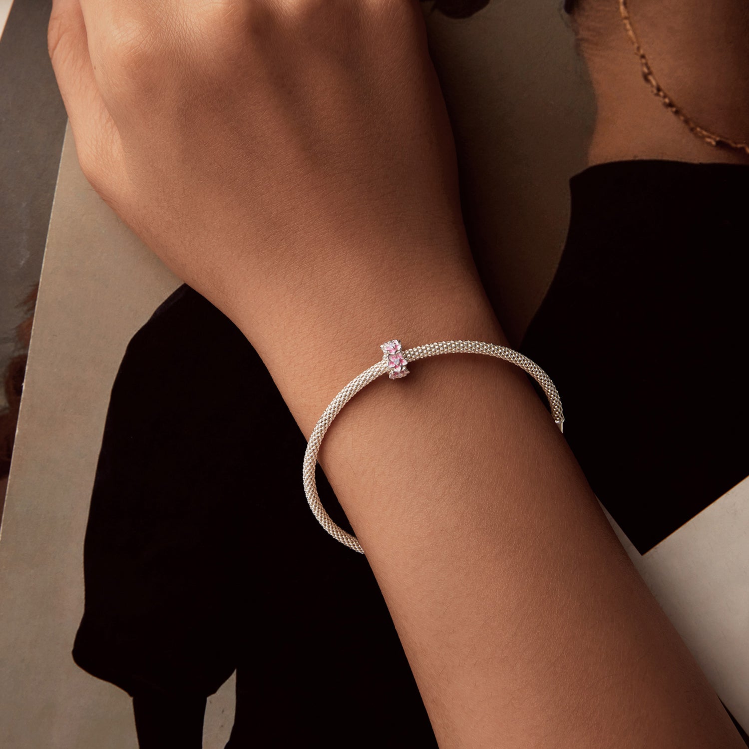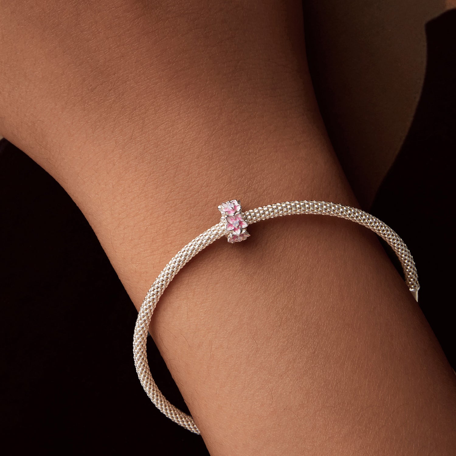 Jemný strieborný prívesok v tvare kvetov prepletených do pásu. Kvetinky sú zdobené ružovou glazúrou a drobnými čírymi kryštálmi, ktoré im dodávajú jemný lesk. Symbolizuje ženskosť, krásu a sviežosť. Skvelý doplnok pre náramky typu Pandora.
