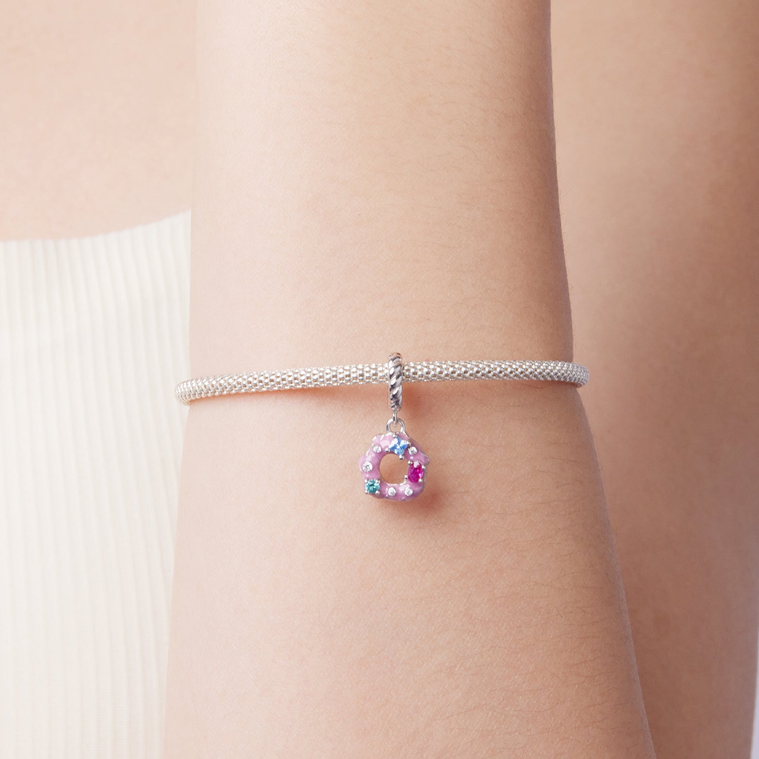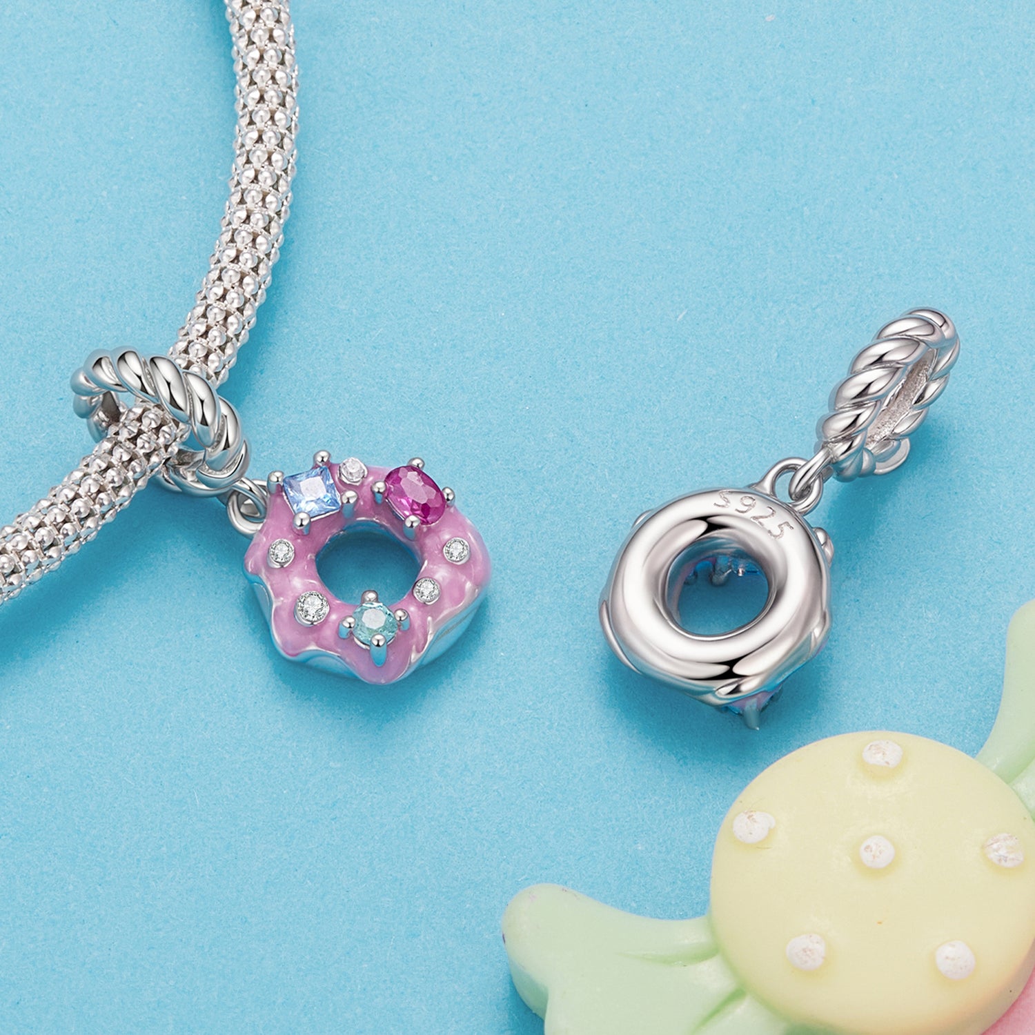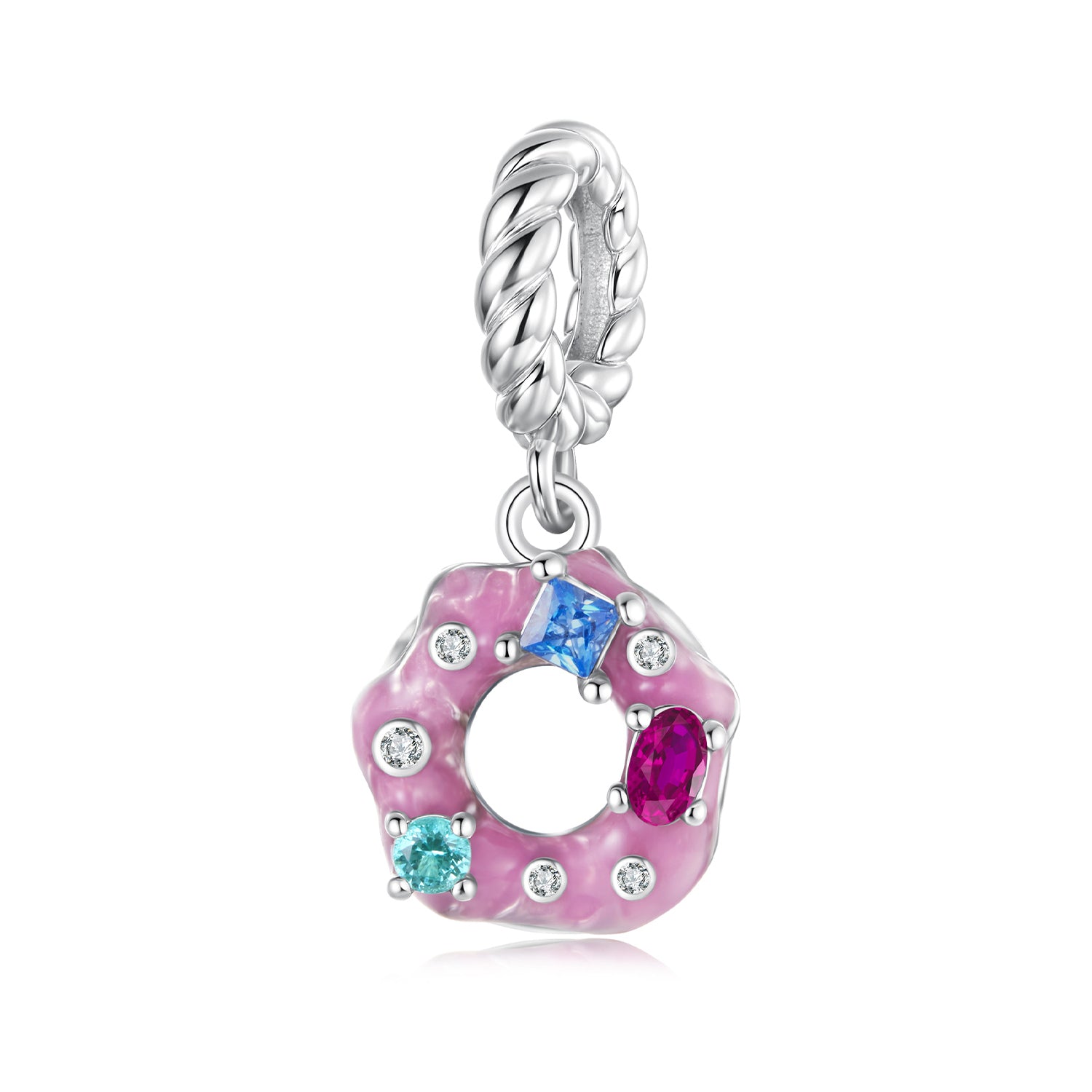 Pridajte do svojho náramku štipku hravosti s týmto originálnym príveskom v tvare donutu. Ružová glazúra pôsobí ako cukrová poleva, zatiaľ čo farebné kamene – modré, ružové a tyrkysové cirkóny – pripomínajú sladké posýpky. Šperk je veselým symbolom radosti zo života a malých každodenných potešení.