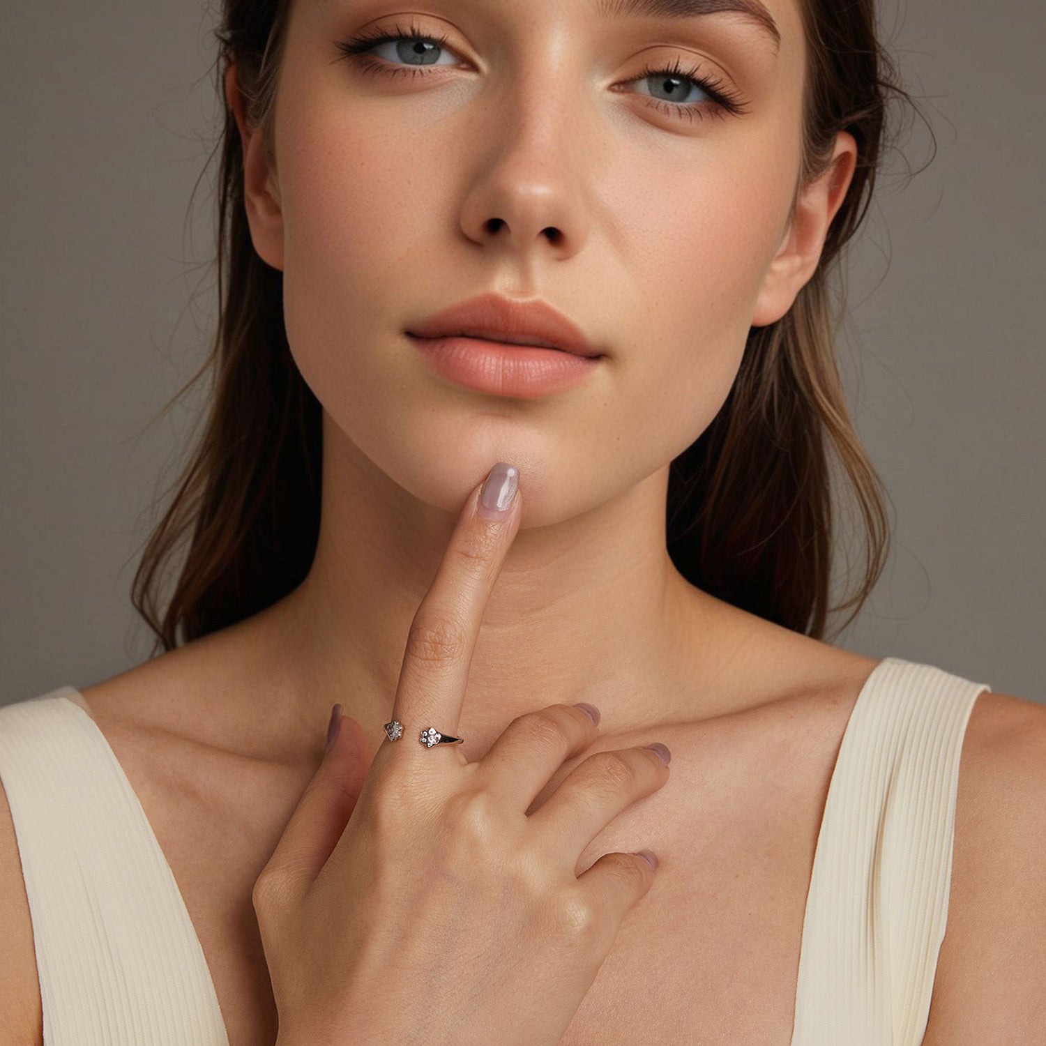 Elegantný strieborný prsteň v tvare dvoch labiek, zdobený ružovými kryštálmi v tvare srdca a drobných bodiek. Symbolizuje lásku k zvieratám a vernosť. Prsteň je otvorený a nastaviteľný, ideálny na každodenné nosenie.