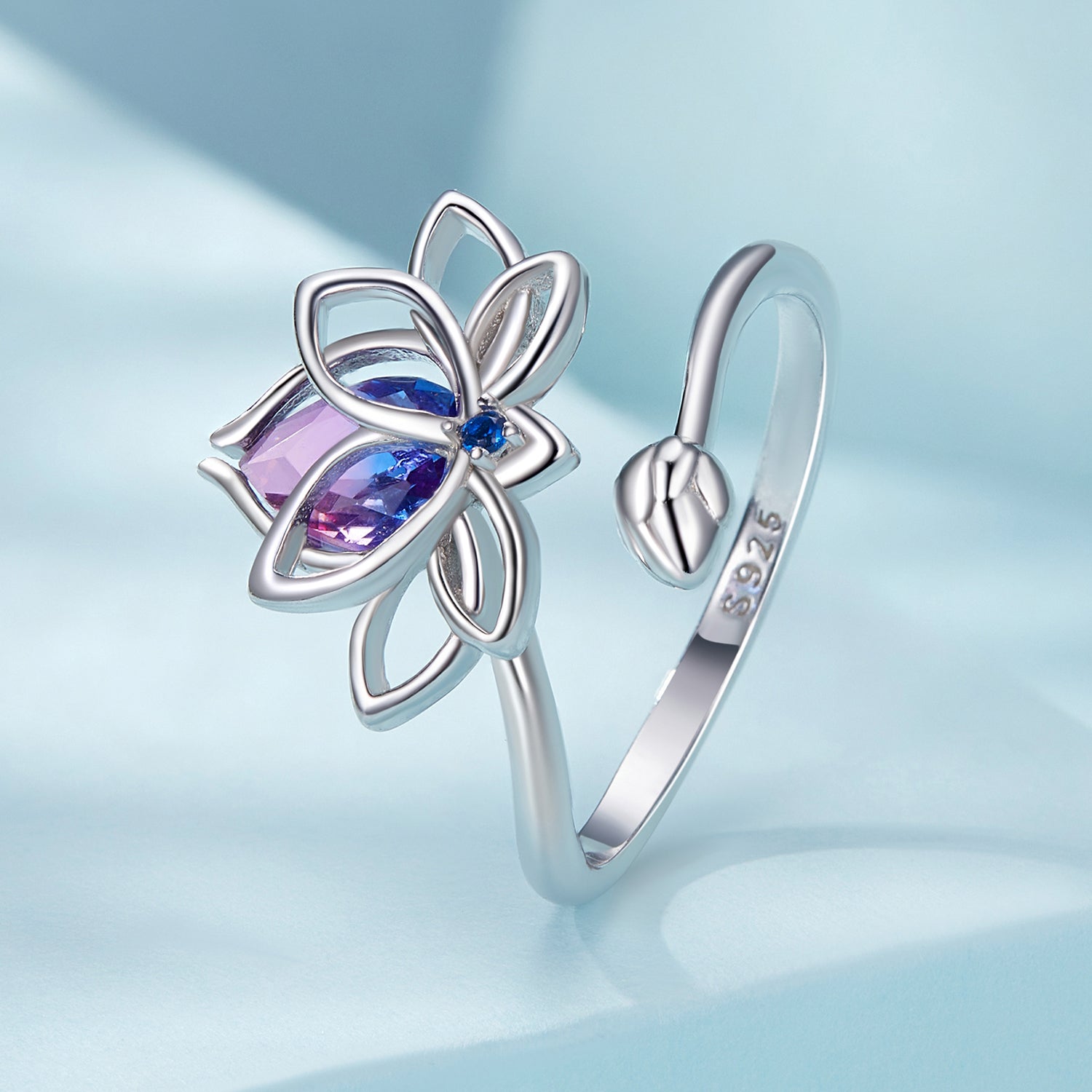Očarujúci prsteň v tvare rozkvitnutého lotosu, ktorý symbolizuje čistotu, rast a harmóniu. V srdci kvetu sa leskne dvojfarebný krištáľ v odtieňoch ružovej a modrej, ktorý dodáva šperku hĺbku a jemnú eleganciu. Vyrobený z rýdzeho striebra 925, ideálny pre každodenné nosenie aj výnimočné príležitosti.