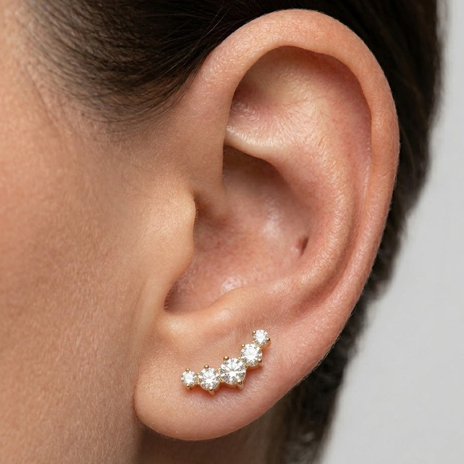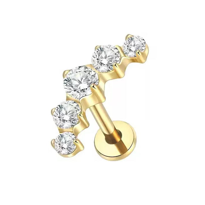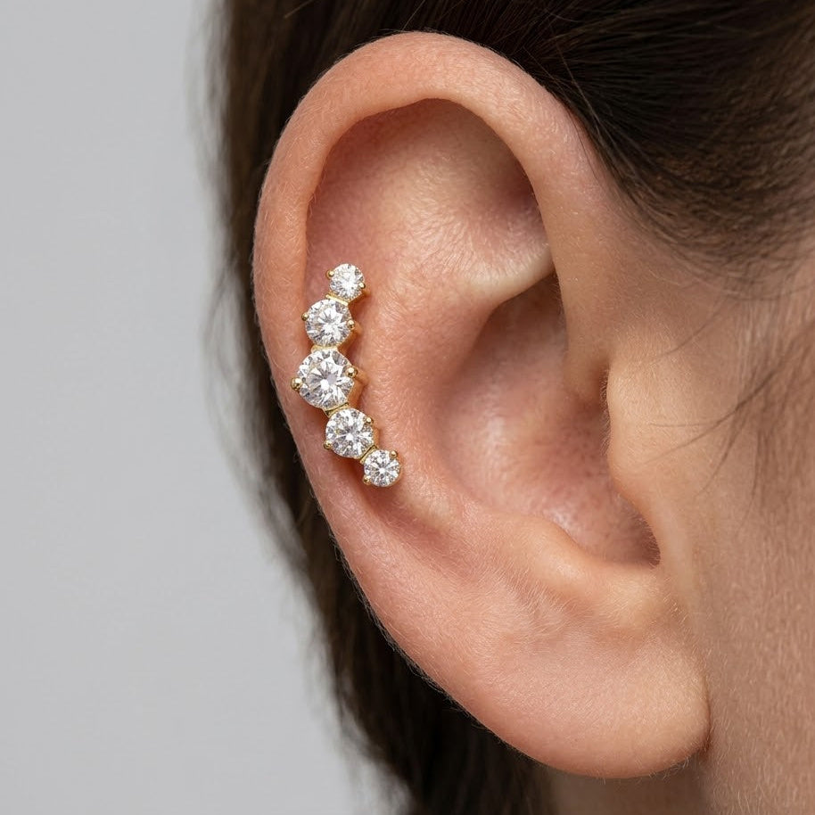 Tento piercing je stelesnením čistoty, luxusu a maximálneho komfortu. Pätica trblietavých zirkónov najvyššej kvality je usporiadaná do jemného, elegantného oblúka, ktorý dokonale kopíruje anatómiu ucha alebo pery. Tento dizajn vytvára efekt žiarivej kaskády, ktorá zachytáva svetlo pri každom pohybe. Vďaka použitiu implantátového titánu (certifikovaný G23/ASTM F136) je tento šperk nielen vizuálne úchvatný, ale aj hypoalergénny, ľahký a extrémne odolný. Je to ideálna voľba pre tie, ktoré hľadajú bezpečný, trvácny a pritom vysoko estetický kúsok pre svoj každodenný styling.